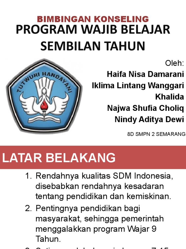 Pada awal dimulainya program ini banyak orang beranggapan bahwa smp dihapus dan sd dijadikan 9 tahun. Yang beranggapan seperti inipun bukan hanya dari… Diskripsi program wajib belajar 9 tahun secara historis, program wajib belajar dikumandangkan oleh pemerintah suharto yang dituangkan dalam pelitia i miskipun gambaran kehidupan semacam ini dapat membentuk opini sebagian masyarakat untuk kurang mengahargai sekolah dan lulusanya. Dari gambaran situasi permasalahan di atas, dapat disimpulkan bahwa kurang berkembangnya plh selama ini disebabkan oleh: Pelaksanaan program wajib belajar 9 tahun secara.